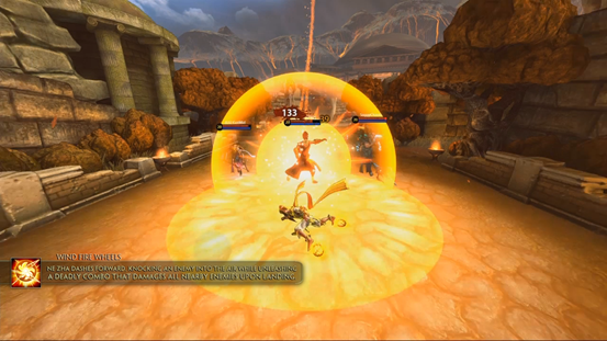 风火轮(4技能) Wind Fire Wheels 哪吒祭起风火轮向前冲锋。如果他击中一名敌对神灵,则会使其暂时浮空,并释放一套组合技(在组合技期间,成功的点击时机会造成暴击),然后将其打回地面。哪吒在跳回初始位置时,对范围内的所有敌人造成额外伤害。 |